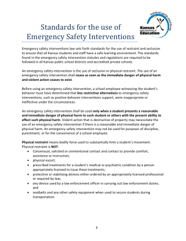 Emergency safety interventions law sets forth standards for the use of restraint and seclusion to ensure that all Kansas students and staff have a safe learning environment. The standards found in the emergency safety intervention statutes and regulations are required to be followed in all Kansas public school districts and accredited private schools.