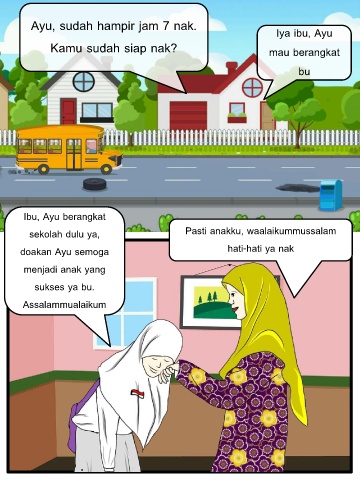 Ayu, sudah hampir jam 7 nak. Iya ibu, Ayu Kamu sudah siap nak? mau berangkat bu Ibu, Ayu berangkat sekolah dulu ya, Pasti anakku, waalaikummussalam doakan Ayu semoga hati-hati ya nak menjadi anak yang sukses ya bu. Assalammualaikum