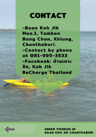 CONTACT -Baan Koh Jik Moo.1, Tambon Bang Chan, Khlung, Chanthaburi. -Contact by phone at 081-995-3533 -Facebook: บ้านเกาะ จิก, Koh Jik ReCharge Thailand GREEN TOURISM IN BAAN KOH JIK CHANTHABURI