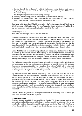Our choirmaster is attempting to assemble some rehearsal tracks on our practice website so we can keep singing, having had to abandon our performance of Messiah this term. He is aiming for a concert at some point entitled 'Have You Ever Been in Love?' which will be a light and frothy affair - our 'summer concerts' are always more light-hearted. We were due to be singing in Birmingham in late September - will that happen now?