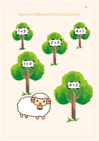 11 เด็กช่วยเจ้ำแกะหำต้นไม้ที่มีผลบวกเท่ำกับ 5 แล้ววงกลมบอกเจ้ำแกะกันเถอะ 1 + 5 4 + 1 2 + 3 1 + 4 4 + 2