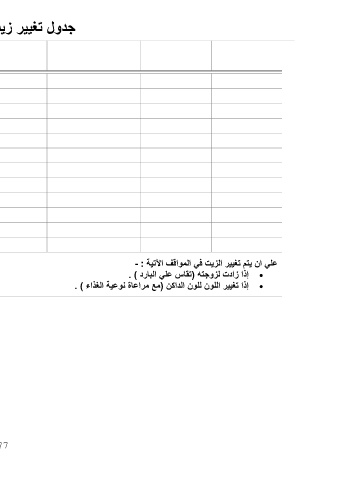 جدول تغيير زيت التا ِريـــخ اليــوم المكــان /الموقع إسم الموظ علي ان يتم تغيير الزيت في المواقف الآتية - : إذا زادت لزوجته (تقاس علي البارد ) . إذا تغيير اللون للون الداكن (مع مراعاة نوعية الغذاء ) . 77