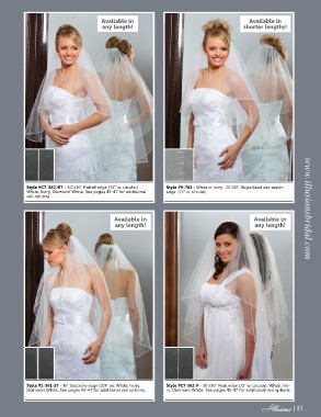 Style #C7-362-RT - 30”x36” Rattail edge (72” w, circular). Style #V-763 - White or Ivory. 25”x30” Bugle bead and sequin www.illusionsbridal.com