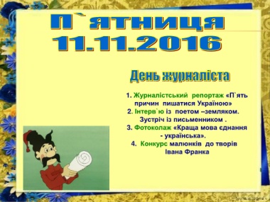 1. Журналістський репортаж «П`ять причин пишатися Україною» 2. Інтерв`ю із поетом –земляком. Зустріч із письменником . 3. Фотоколаж «Краща мова єднання - українська». 4. Конкурс малюнків до творів Івана Франка