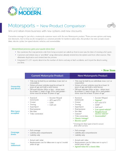 Customize coverage for just what a motorcycle customer wants with the new Motorsports product. There are new options and many