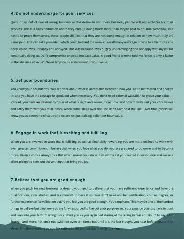 This is is a a a a a a classic situation where they they end up doing much more than they’re paid to do do But somehow in in a a a a a a desire to to prove themselves these people still feel that they they are are not doing enough in in relation to to how much they they are are being paid This can set a a a a a a a a a a precedent which could be be hard to to remove I recall many years ago driving to to a a a a a a a a a a client site and deep inside I I was was was unhappy unhappy and and annoyed This was was was because I I was was was hugely undercharging and and unhappy unhappy with myself for continually doing so Don’t compromise on on on on price price increase value A good friend of mine told me “price is is only a a a a a factor in the absence of of value” Never let price be a a a a a statement of of your value value 5 Set your boundaries