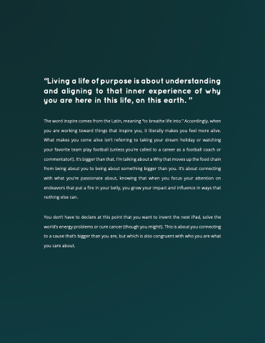 Accordingly when you you you are working toward things that inspire you you you it it literally makes you you you feel more alive What makes you you come alive isn’t referring to taking your dream holiday or watching your favorite team play football football (unless you’re called to a a a a a a a a a a a career as a a a a a a a a a a a football football coach or or commentator!) It’s bigger than that that I’m talking about a a a a a a a a Why that that moves up the food chain from being being about about about you you to being being about about about something bigger than you you It’s about about about connecting with what you’re passionate about knowing that when you you you focus your attention on on on endeavors that that put a a a a a a a fire in in in your your belly you you you grow your your impact and influence in in in ways that that nothing else can You don’t have to to declare at at this point that you want to to invent the the next iPad solve the the world’s energy problems or or cure cancer (though you you might!) This is is about you you connecting to a a a a a a a a cause that’s bigger than you you are are but which is also congruent with who you you are are what you care about