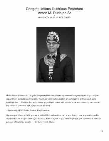 Noble Anton Rudolph Sr., It gives me great pleasure to extend my warmest congratulations to you on your appointment as Illustrious Potentate. Your hard work and dedication are exhilarating and have not gone unrecognized. I trust that you will continue your diligent duties with upmost pride and streaming success on the behalf of Golconda #24. I wish you all the best.