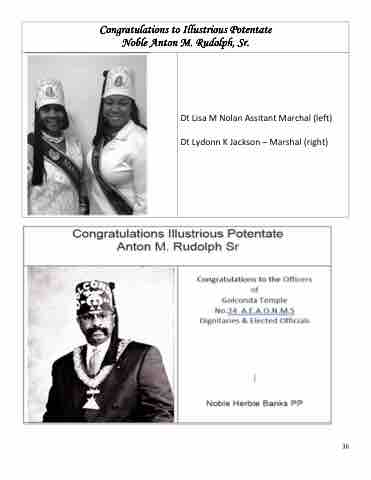 Congratulations to Illustrious Potentate Noble Anton M. Rudolph, Sr. Dt Lisa M Nolan Assitant Marchal (left) Dt Lydonn K Jackson – Marshal (right) 36