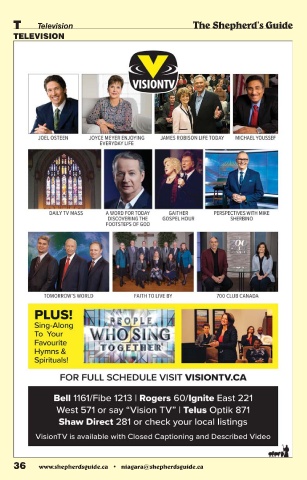 T T T T T Television The Shepherd’s Guide TELEVISION 36 www.shepherdsguide.ca • niagara@shepherdsguide.ca