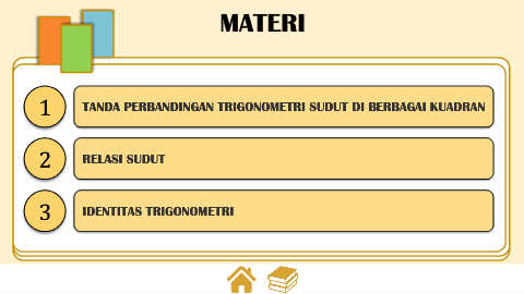 MATERI 1 TANDA PERBANDINGAN TRIGONOMETRI SUDUT DI BERBAGAI KUADRAN 2 RELASI SUDUT 3 IDENTITAS TRIGONOMETRI