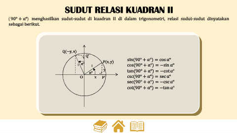 90° + α° menghasilkan sudut-sudut di kuadran II di dalam trigonometri, relasi sudut-sudut dinyatakan