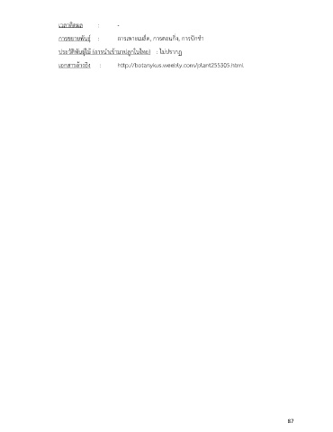 เวลาติดผล : - การขยายพันธุ์ : การเพาะเมล็ด, การตอนกิ่ง, การปักช า ประวัติพันธุ์ไม้ (การน าเข้ามาปลูกในไทย) : ไม่ปรากฏ เอกสารอ้างอิง : http://botanykus.weebly.com/plant255305.html 87