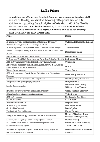 In addition to raffle prizes donated from our generous marketplace stall holders on the day, we have the following raffle prizes available. In addition to supporting the school, the raffle is also in aid of the Charlie Waller Memorial Trust & Thames Valley Air Ambulance. Purchase tickets at the entrance to the Fayre. The raffle will be called shortly after 4pm near the BMR drinks tent.