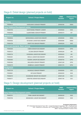 IDT: Independent Development Trust; CDC = Coega Development Corporation; TMT = The Mvula Trust; DoE = Department of Education; AW = Amatola Water; DPW = Department of Public Works; DBSA = Development Bank of Southern Africa