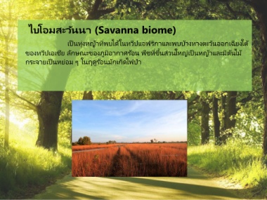 ไบโอมสะวันนา (Savanna biome) ่ เป็นทุ่งหญ้าทีพบได้ในทวีปแอฟ ริกาและพบบ้างทางตะวันออกเฉียงใต้ ่ ้ ของทวีปเอเชีย ลักษณะของภูมิอากาศร ้อน พืชทีขึนส่วนใหญ่เป็นหญ้าและมีต้นไม้ กระจายเป็นหย่อม ๆ ในฤดูร ้อนมักเกิดไฟป่า