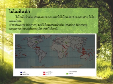 ้ ไบโอมในน า ้ ่ ไบโอมในน าทีพบเป็นองค์ประกอบหลักใบไบโอสเฟียร ์ประกอบด้วย ไบโอม ้ แหล่งน าจืด ้ (Freshwater biomes) และไบโอมแหล่งน าเค็ม (Marine Biomes) ้ และพบกระจายอยู่ทังเขตภูมิศาสตร ์ในโลกนี ้