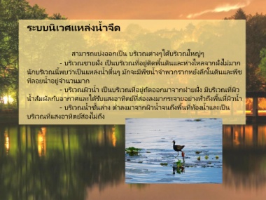นักบริเวณนีพบว่าเป็นแหล่งน าตืนๆ มักจะมีพืชน าจ าพวกรากหยังลึกในดินและพืช