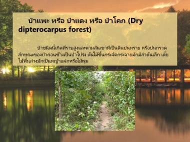 ป่ าแพะ หรือ ป่ าแดง หรือ ป่ าโคก (Dry dipterocarpus forest) ้ ่ ่ ป่าชนิดนีเกิดทีราบสูงและตามสันเขาทีเป็นดินปนทราย หรือปนกรวด ้ ้ ลักษณะของป่าค่อนข้างเป็นป่าโปร่ง ต้นไม้ขึนกระจัดกระจายมักมีล าต้นเล็ก เตีย ้ ไม้พืนล่างมักเป็นหญ้าแฝกหรือไม้พุ่ม