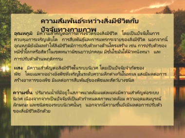 นิเวศ เนืองจากจากเป็นปัจจัยทีเป็นตัวก าหนดสภาพแวดล้อม ความอุดมสมบูรณ์