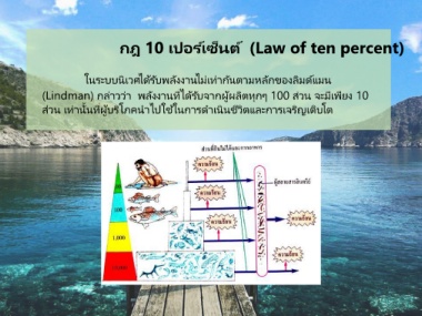 กฎ 10 เปอร ์เซ็นต์ (Law of ten percent) ในระบบนิเวศได้รับพลังงานไม่เท่ากันตามหลักของลิมด์แมน ่ (Lindman) กล่าวว่า พลังงานทีได้รับจากผู้ผลิตทุกๆ 100 ส่วน จะมีเพียง 10 ่ ้ ส่วน เท่านันทีผู้บริโภคน าไปใช ้ในการด าเนินชีวิตและการเจริญเติบโต