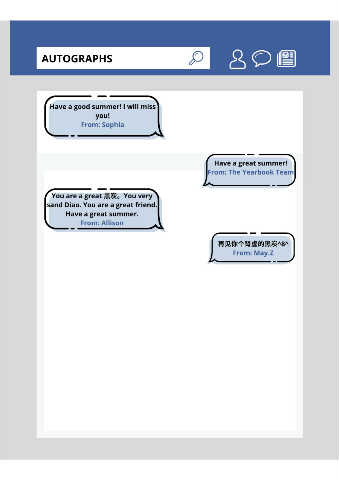 AUTOGRAPHS Have a good summer! I will miss you! From: Sophia Have a great summer! From: The Yearbook Team You are a great ⿊炭。You very sand Diao. You are a great friend. Have a great summer. From: Allison 再⻅你个肾虚的⿊炭^8^ From: May.Z