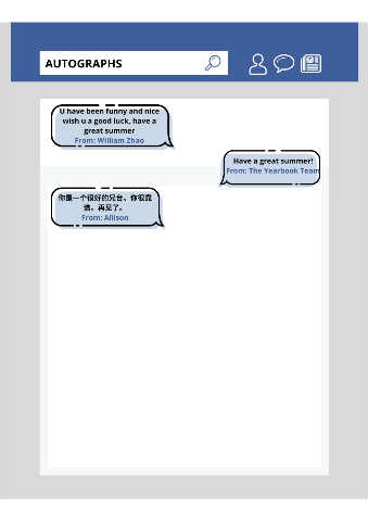 AUTOGRAPHS U have been funny and nice wish u a good luck, have a great summer From: William Zhao Have a great summer! From: The Yearbook Team 你是⼀个很好的兄台。你很靠 谱。再⻅了。 From: Allison
