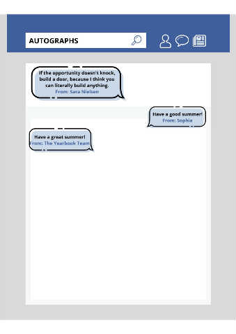 AUTOGRAPHS If the opportunity doesn't knock, build a door, because I think you can literally build anything. From: Sara Nielsen Have a good summer! From: Sophia Have a great summer! From: The Yearbook Team