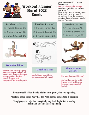 Konsentrasi Latihan Kamis adalah core, perut, dan sesi sparring.