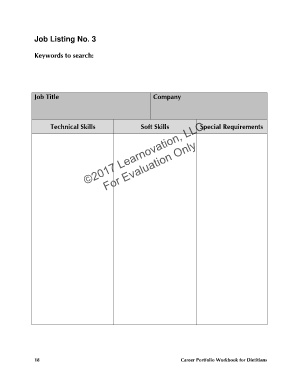 Job Listing No. 3 Keywords to search: Job Title Company Technical Skills Soft Skills Special Requirements ©2017 Learnovation, LLC For Evaluation Only 18 Career Portfolio Workbook for Dietitians