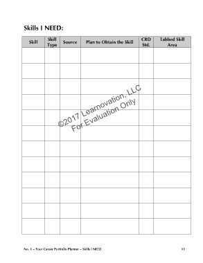 Skills I NEED: Skill CRD Tabbed Skill Skill Source Plan to Obtain the Skill Type Std. Area ©2017 Learnovation, LLC For Evaluation Only No. 1 – Your Career Portfolio Planner – Skills I NEED 11