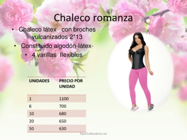 Chaleco romanza • Chaleco látex con broches vulcanizados 2*13 • Constituido algodón-látex- • 4 varillas flexibles UNIDADES PRECIO POR UNIDAD 1 1100 6 700 10 680 20 650 50 630 fajasmoldeadoras.mx