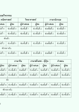 13.10 – 14.00 น. ช่วงชั้นที่ 1 ช่วงชั้นที่ 2 ช่วงชั้นที่ 2 ช่วงชั้นที่ 1 ช่วงชั้นที่ 3 ช่วงชั้นที่ 4 ช่วงชั้นที่ 4 ช่วงชั้นที่ 3 ช่วงชั้นที่ 1 ช่วงชั้นที่ 2