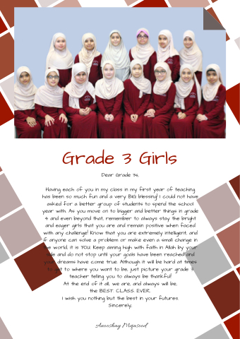 Having each of you in my class in my first year of teaching has been so much fun and a very BIG blessing! I could not have asked for a better group of students to spend the school year with. As you move on to bigger and better things in grade 4 and even beyond that, remember to always stay the bright and eager girls that you are and remain positive when faced with any challenge! Know that you are extremely intelligent, and if anyone can solve a problem or make even a small change in the world, it is YOU. Keep aiming high with faith in Allah by your side and do not stop until your goals have been reached and your dreams have come true. Although it will be hard at times to get to where you want to be, just picture your grade 3 teacher telling you to always be thankful!