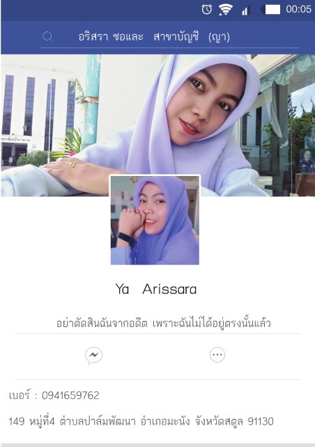 00:05 อริสรา ซอและ สาขาบัญชี (ญา) Ya Arissara อยาตัดสินฉันจากอดีต เพราะฉันไมไดอยูตรงนั้นแลว เบอร : 0941659762 149 หมูที่4 ตำบลปาลมพัฒนา อำเภอมะนัง จังหวัดสตูล 91130