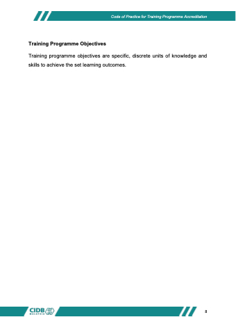Code of Practice for Training Programme Accreditation Training Programme Objectives Training programme objectives are specific, discrete units of knowledge and skills to achieve the set learning outcomes. 8