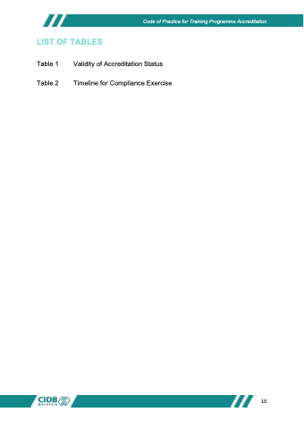 LIST OF TABLES Table 1 Validity of Accreditation Status Table 2 Timeline for Compliance Exercise Code of Practice for Training Programme Accreditation 10