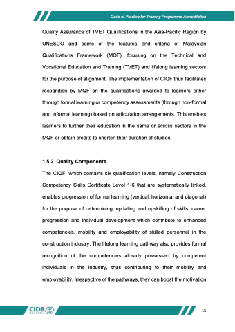 Quality Assurance of TVET Qualifications in the Asia-Pacific Region by UNESCO and some of the features and criteria of Malaysian Qualifications Framework (MQF), focusing on the Technical and Vocational Education and Training (TVET) and lifelong learning sectors for the purpose of alignment. The implementation of CIQF thus facilitates recognition by MQF on the qualifications awarded to learners either through formal learning or competency assessments (through non-formal and informal learning) based on articulation arrangements. This enables learners to further their education in the same or across sectors in the MQF or obtain credits to shorten their duration of studies.