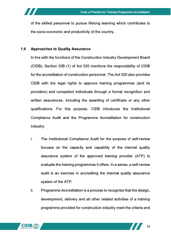 for the accreditation of construction personnel. The Act 520 also provides CIDB with the legal rights to approve training programmes (and its providers) and competent individuals through a formal recognition and written assurances, including the awarding of certificate or any other qualifications. For this purpose, CIDB introduces the Institutional Compliance Audit and the Programme Accreditation for construction Industry: