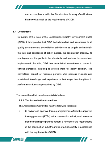 By nature of the roles of the Construction Industry Development Board (CIDB), it is imperative that CIDB be independent and transparent in all quality assurance and accreditation activities so as to gain and maintain the trust and confidence of policy makers, the construction industry, its employees and the public in the standards and systems developed and implemented. For this, CIDB has established committees to serve in various purposes, including to provide input for policy decision. The committees consist of resource persons who possess in-depth and specialised knowledge and experience in their respective disciplines to perform such duties as prescribed by CIDB.