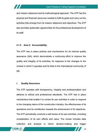 The ATP operates with transparency, integrity and professionalism and adheres to ethical and professional standards. The ATP has in place mechanisms that enable it to review its own activities in order to respond to the changing nature of the construction industry, the effectiveness of its operations and its contribution towards the achievement of its objectives. The ATP periodically conducts a self-review of its own activities, including consideration of its own effects and value. The review includes data collection and analysis to inform decision-making and trigger