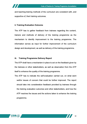 The ATP has to gather feedback from trainees regarding the content, trainers and methods of delivery of the training programme as the mechanism to identify improvement to the training programme. The information serves as input for further improvement of the curriculum design and development, as well as delivery of the training programme.