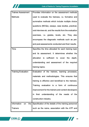 Evaluation of the trainers, learning processes, materials and methodologies. This ensures that training is effective and beneficial to the trainees. Training evaluation is a form of continuous improvement for the trainers and content developers in their understanding of the needs of the construction industry.