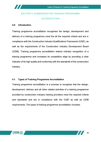 Training programme accreditation is a process to recognise that the design, development, delivery and all other related activities of a training programme provided by construction industry training providers meet the required criteria and standards and are in compliance with the CIQF as well as CIDB requirements. The types of training programme accreditation includes: