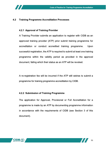 A Training Provider submits an application to register with CIDB as an approved training provider (ATP) prior submit training programme for accreditation or conduct accredited training programme. Upon successful registration, the ATP is required to submit at least one training programme within the validity period as provided in the approval document, failing which their status as an ATP will be revoked.