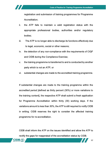 If substantial changes are made to the training programme within the accredited period [defined as thirty percent (30%) or more variations to the training content], the respective ATP shall submit a fresh application for Programme Accreditation within thirty (30) working days. If the variations amount to less than 30%, the ATP is still required to notify CIDB in writing. CIDB reserves the right to consider the affected training programme for re-accreditation.