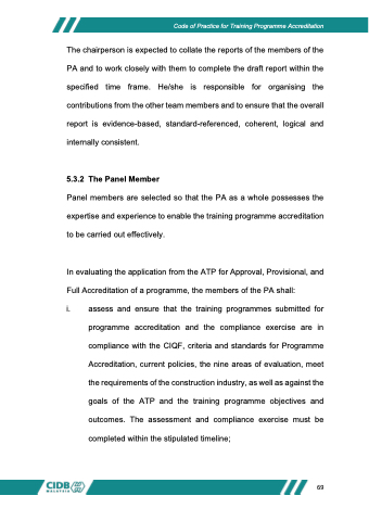 programme accreditation and the compliance exercise are in compliance with the CIQF, criteria and standards for Programme Accreditation, current policies, the nine areas of evaluation, meet the requirements of the construction industry, as well as against the goals of the ATP and the training programme objectives and outcomes. The assessment and compliance exercise must be completed within the stipulated timeline;