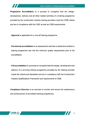 Programme Accreditation is a process to recognise that the design, development, delivery and all other related activities of a training programme provided by the construction industry training providers meet the CIDB criteria and are in compliance with the CIQF as well as CIDB requirements.
