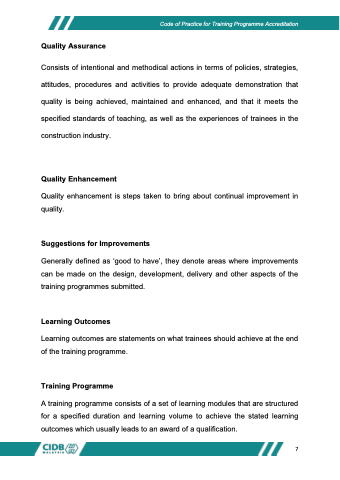 Consists of intentional and methodical actions in terms of policies, strategies, attitudes, procedures and activities to provide adequate demonstration that quality is being achieved, maintained and enhanced, and that it meets the specified standards of teaching, as well as the experiences of trainees in the construction industry.