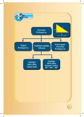 Peta onsep K c Teorema a Pythagoras b 2 2 2 c = a + b Penerapan Tripel Segitiga-segitiga Teorema Pythagoras Khusus Pythagoras Segitiga Segitiga Siku-Siku Siku-Siku dengan Sudut Sama kaki 30° - 60° - 90° 3